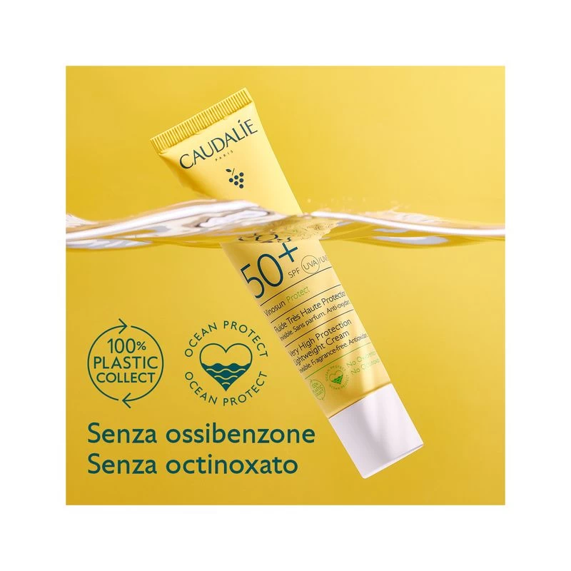 Caudalie presenta il primo trattamento della sua rivoluzionaria gamma di solari: il Fluido ad Altissima Protezione SPF50+ Vinosun Protect, che protegge efficacemente il viso e il collo dai raggi UVA/UVB offrendo un’azione antiossidante alle pelli più sensibili. Grazie alla sua texture invisibile, ultra leggera e senza profumo, assicura una protezione clean e invisibile, per tutti i giorni. Senza compromessi tra protezione della pelle e protezione della natura, la sua formula è altamente biodegradabile e non tossica per l’ecosistema marino.