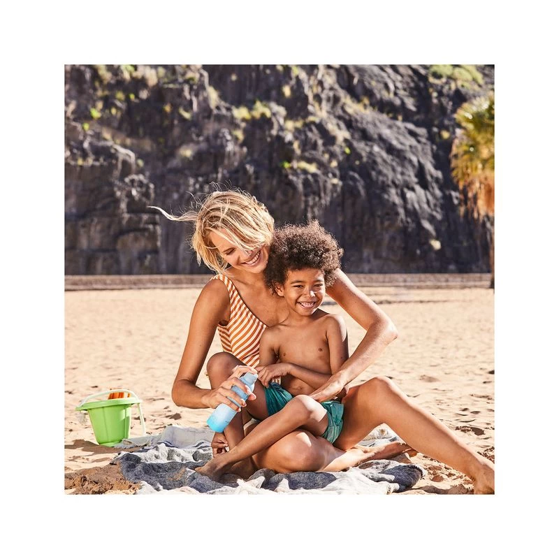 Fotoprotezione corpo in spray trasparente, fresco e dall’assorbimento immediato specialmente formulato per la pelle dei bambini a partire da 3 anni.