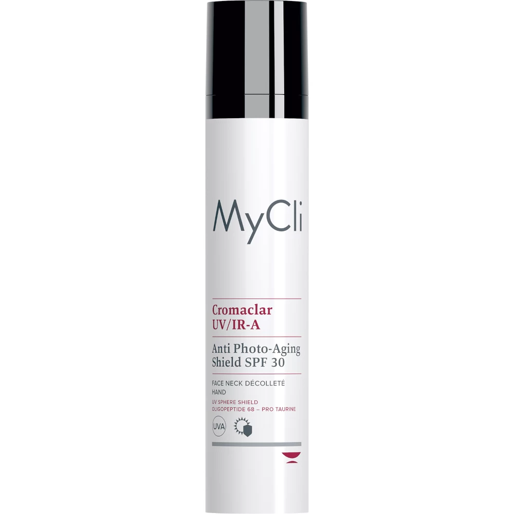 MyCli CROMACLAR UV/IR-A SPF30 è uno dei migliori fluidi protettivi ad azione anti photo-aging che previene la formazione di macchie cutanee e contrasta lo stress ossidativo indotto dai raggi UVA, UVB e infrarossi A (IR-A), per una pelle protetta e dall’aspetto più chiaro e uniforme.