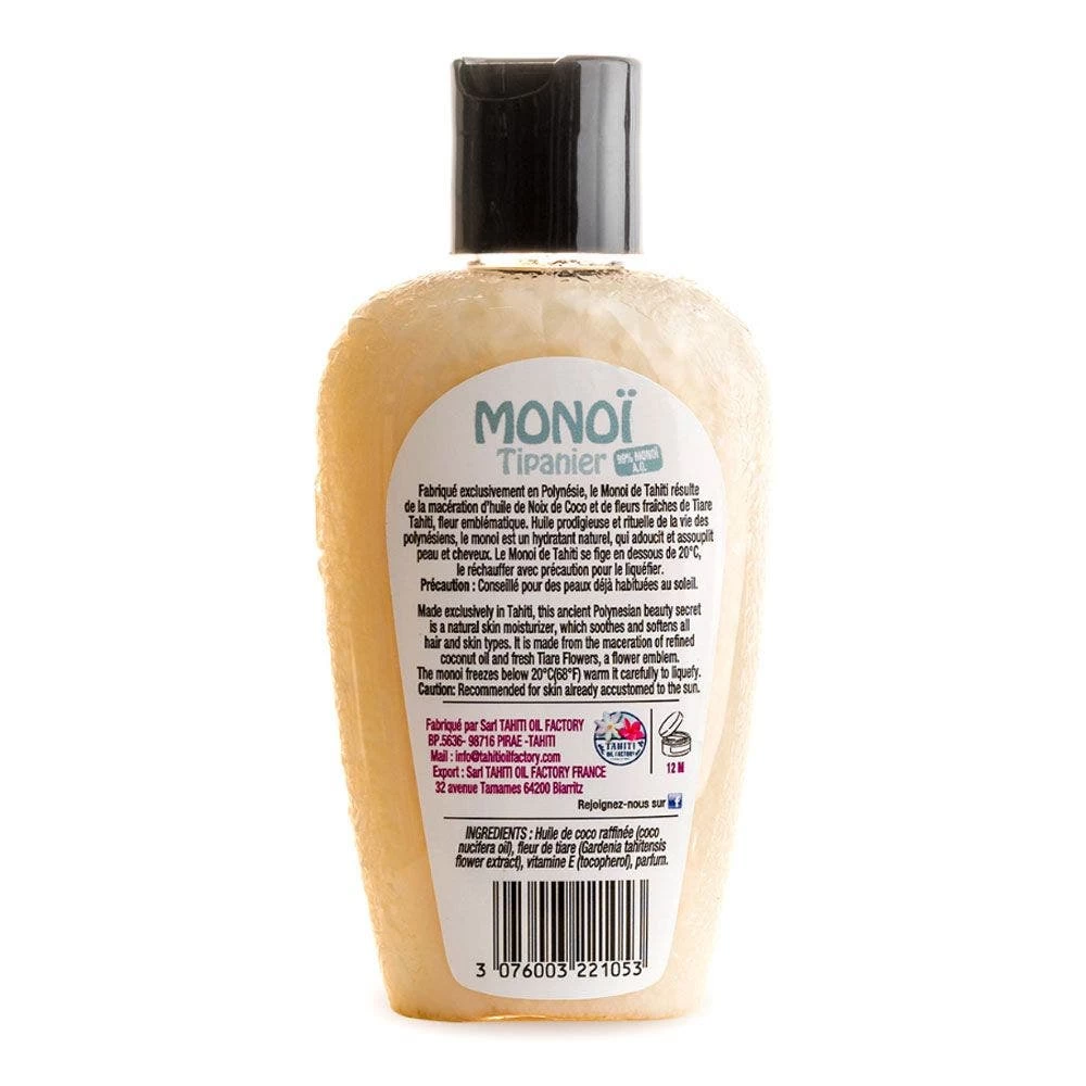 Prodotto esclusivamente in Polinesia, il Monoï di Tahiti è il risultato della macerazione dell’olio di Cocco e dei fiori freschi dell’emblematico Tiaré di Tahiti. Olio prodigioso e rituale della vita polinesiana, il Monoï è un idratante naturale che ammorbidisce e leviga la pelle e i capelli.