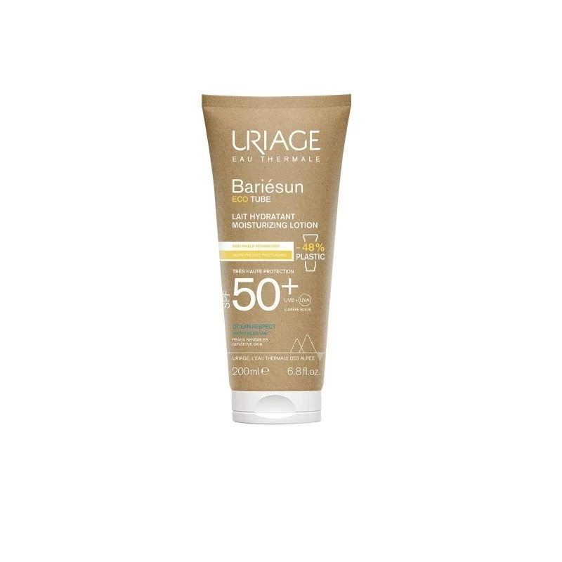 Uriage Bariésun Latte Idratante SPF50+ in Eco-Tubo combina un complesso filtrante ad alte prestazioni e due brevetti dermatologici per proteggere la pelle, prevenire i danni cellulari e il fotoinvecchiamento indotto da UVA, UVB e luce blu.
